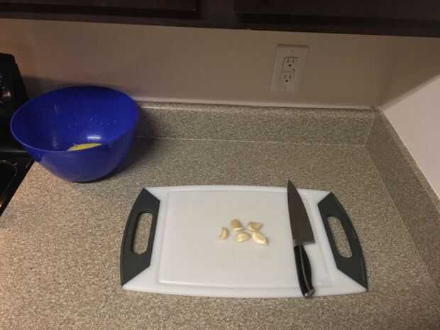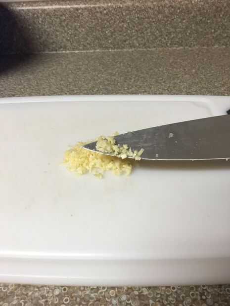 En un tablero de corte limpio, pelar y picar los dientes de ajo en trozos muy pequeños. Si usted no quiere hacer ese trabajo, no dude en poner en un procesador de alimentos o una bala y pulse hasta que el ajo se corta en pedazos pequeños. Añadir el ajo en el bol con los huevos batidos.