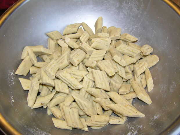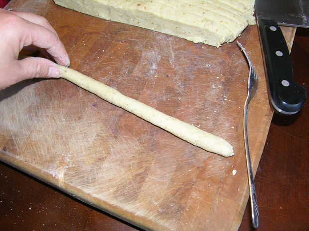 Cada pieza del rodillo presionando suavemente con los dedos separados. El objetivo es hacer una cuerda uniformemente distribuido. Para los ñoquis más cortos, más pesados, enrolle la masa en forma de gruesas cuerdas. Rollo de cuerdas más para ñoquis más fino.