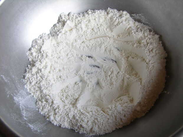 Montículo de flourin un recipiente grande o en el centro de una tabla de madera o una encimera limpia y seca.