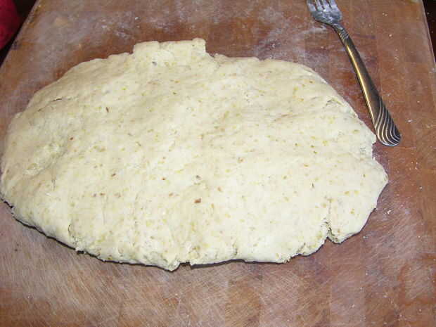 Amasar hasta que los ingredientes se combinan muy bien. Forma un amplio rectángulo con la masa.