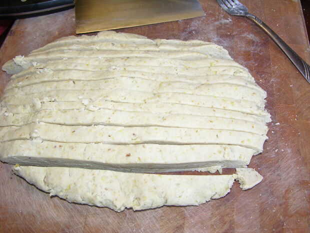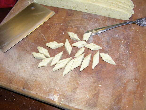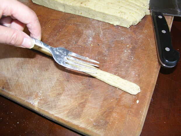 Use un tenedor para hacer las costillas en cada cuerda. Cortar en trozos de 1 pulgada.