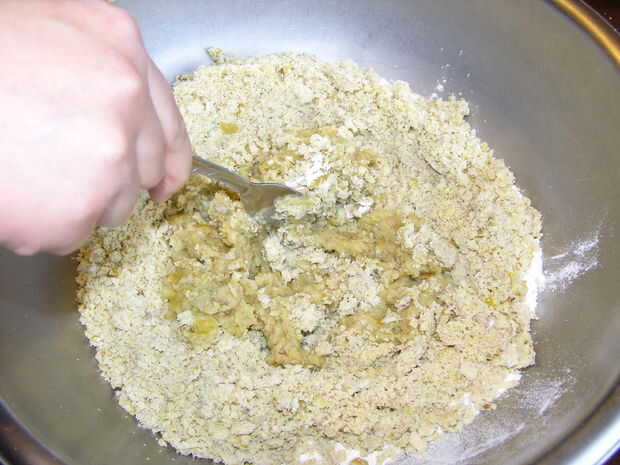 Con un tenedor, comienzan a incorporar ingredientes para la masa tirando harina en el centro.