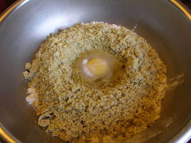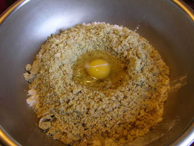 Crear otro pozo en el centro de la castaña. Rompa un huevo dentro y agregue una 1/2 cucharadita de sal.
