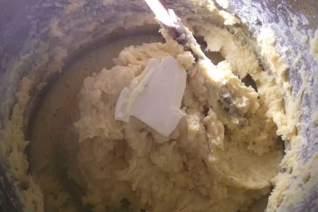 • quitar del calor y agregue el queso rallado y mantequilla - mezcle hasta combinar entonces punta sobre una superficie engrasada o bandeja