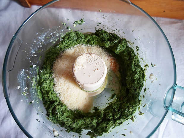 Añadir el huevo y queso parmesano y seguir mezclando hasta obtener un verde "salsa".