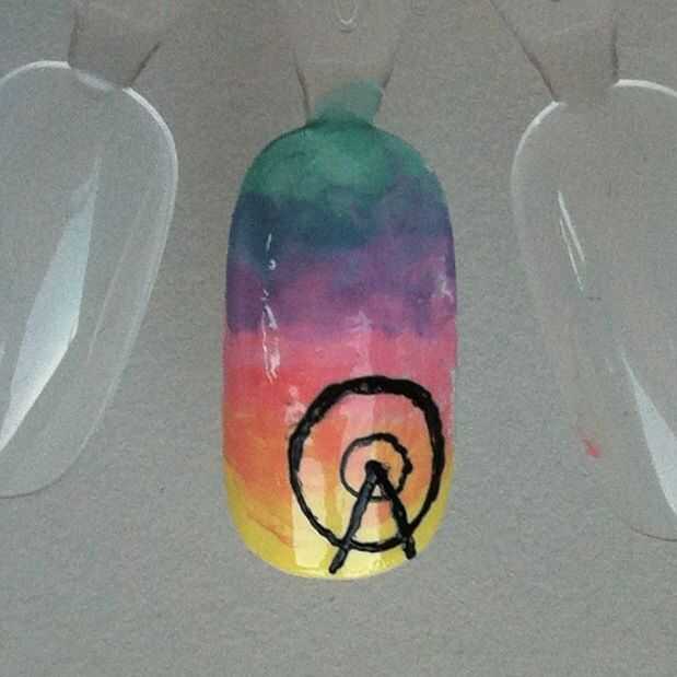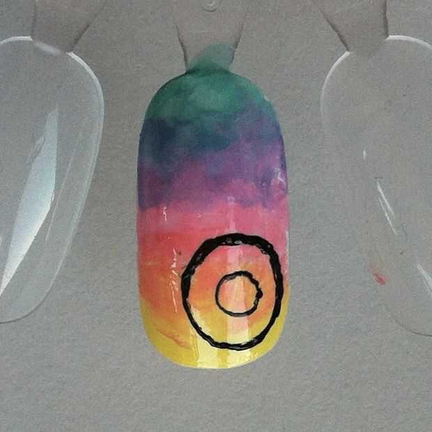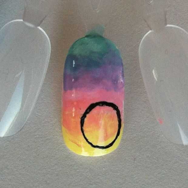 4. usando un negro Migi uñas pluma de arte (o cepillo), dibuja un círculo en la esquina inferior derecha de la uña.