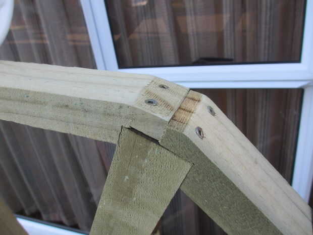 El siguiente paso fue unirse a los radios con piezas de madera para formar una rueda octogonal. Mis rayos no fueron espaciadas muy uniformemente y parte exterior de la rueda fueron todas diferentes longitudes. Me corte las juntas simples en la Sierra de cinta y atornilladas a las piezas de la rueda en los radios. Las articulaciones que hice eran muy aproximada e inexacta, pero esta parte de la rueda no va a ver mucho peso o tensión.