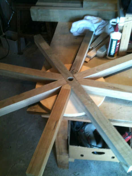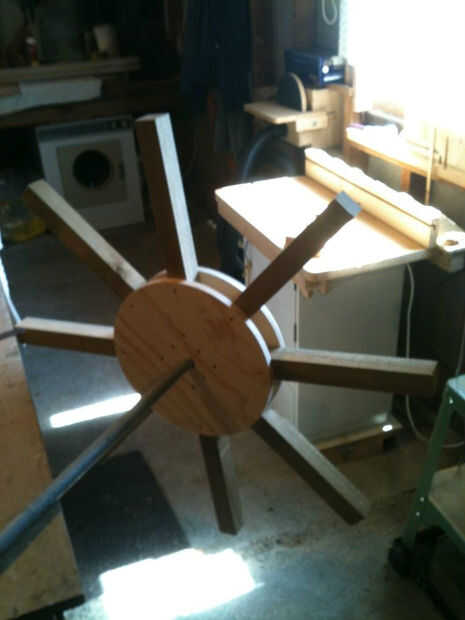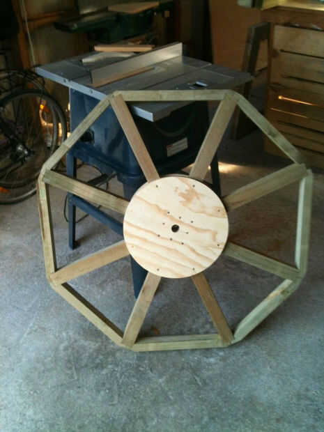 I cortar dos círculos de 30cm de madera contrachapada en la mesa de fresadora y había perforado los agujeros de 30mm en sus centros. Algunos de los 2x4s corté por la mitad para hacer los rayos de la rueda. Me incorporé a dos longitudes con un empalme de media caña, perforó un agujero en el empalme (esta debilita la articulación mucho) y cortar a ángulos de 45 grados en los radios de otros. Atornillado los círculos de madera sobre los radios, asegurándose de alinear todos los agujeros y espaciar uniformemente los radios.