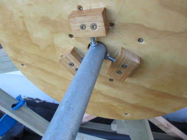 Hice tres bloques de madera con agujeros para sujetar una tuerca de M6 y un perno. Estos le permiten hacer ajustes finos en la alineación del eje con respecto a la rueda para eliminar el bamboleo y también actúa para bloquear la rueda en el eje.