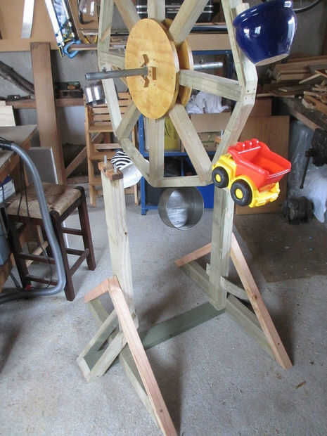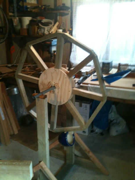 La noria parece ser muy indulgente hacia cubos ineficaces - la maceta y el recogedor de polvo, por ejemplo, no recoger mucha agua, pero la inercia de la rueda mantiene las cosas girando y no es un problema.