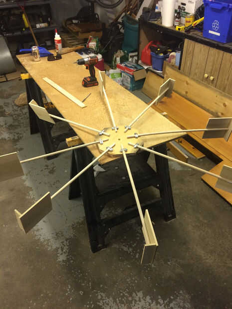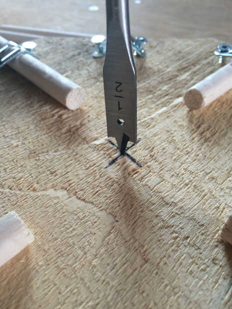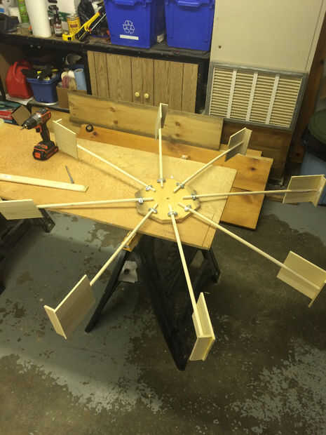 10 - encontrar el centro de la pieza central y perfore un orificio de 1/2" que será el principal punto de inflexión para la noria.