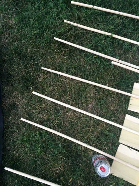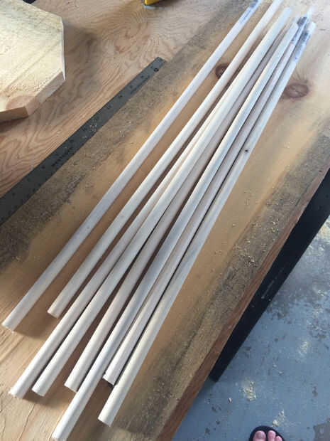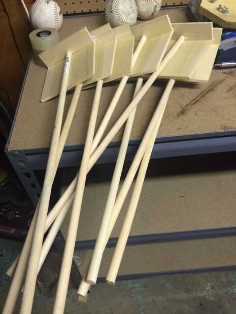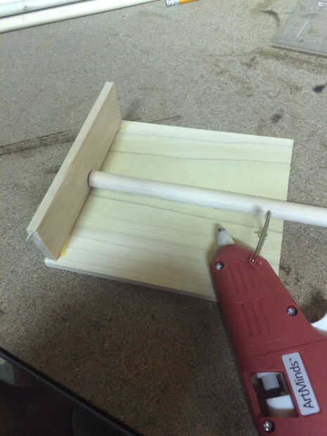 6-cortar la madera clavijas en mitad de la 2' marca y pegamento caliente les a la paleta como se muestra.