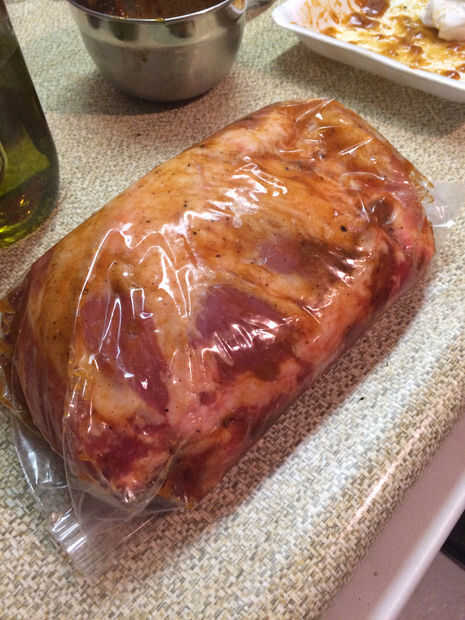 Vierta 1/2 taza de aceite de oliva en un recipiente y luego añada 1 buen puñado de azúcar morena. Ahora, agregue 4-6 cucharadas de su especia de rub o bistec de costilla favorito. Añadir 2 cucharadas de vinagre de sidra de Apple y luego una cantidad generosa de sal marina. Añadir un poco de pimienta y luego mezclar todo muy bien. Debe formar una pasta y que usted puede frotar todo sobre el hombro de cerdo y el lugar en una bolsa de congelador grande para descansar durante la noche.