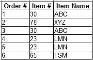 Dependencia funcional se produce cuando todos los atributos no clave dependen de la clave primaria. Así, si una tabla tiene sólo una llave primaria, es dependiente completamente funcional. En la figura anterior no cumple con los requisitos de la segunda forma normal porque el atributo no principal (nombre del artículo) sólo es dependiente de la clave primaria (Item #). Esta una tabla debe ser roto en dos.