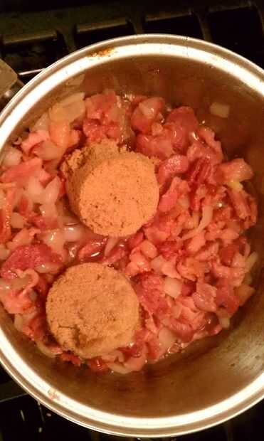 El tocino y la cebolla, agregar 1/2 taza de vinagre de manzana y aumentar su calor algunos. Desea que el calor lo suficientemente alto para cocinar algunos de vinagre, pero deja el sabor a manzana agradable. Una vez que el vinagre ha cocinado hacia abajo un poco, añadir la misma cantidad de azúcar morena y reducir el calor. Revuelva todo junto. Esto hará que un lío de tocino goopy espeso que es perfecto para nuestras necesidades. Reducir el calor le ayudará a evitar que se quemen la panela como revolviendo constantemente.