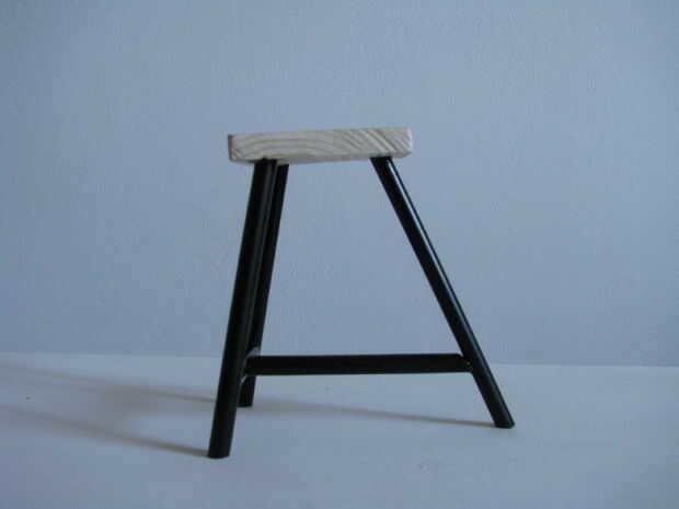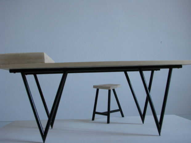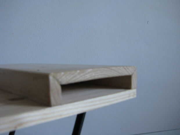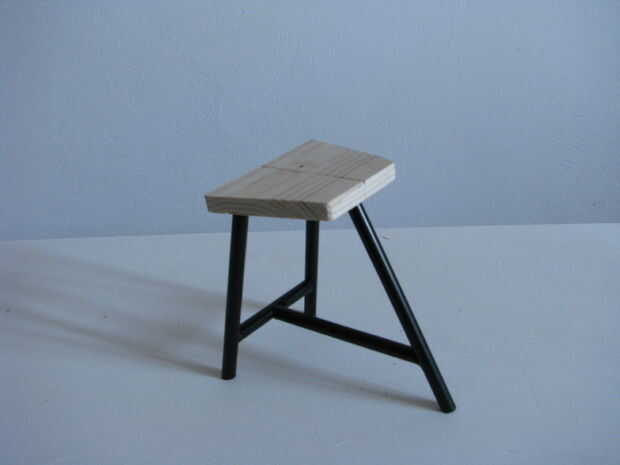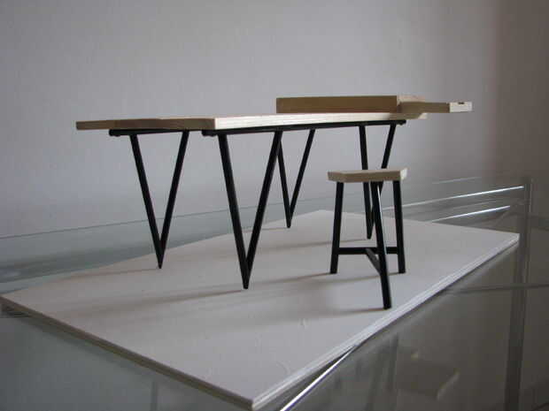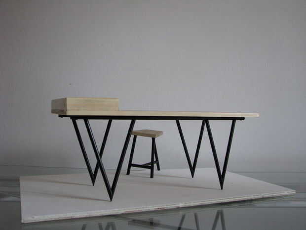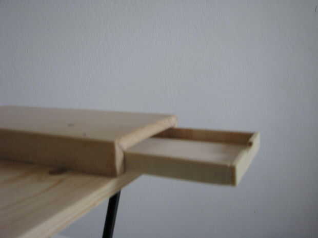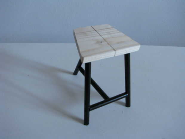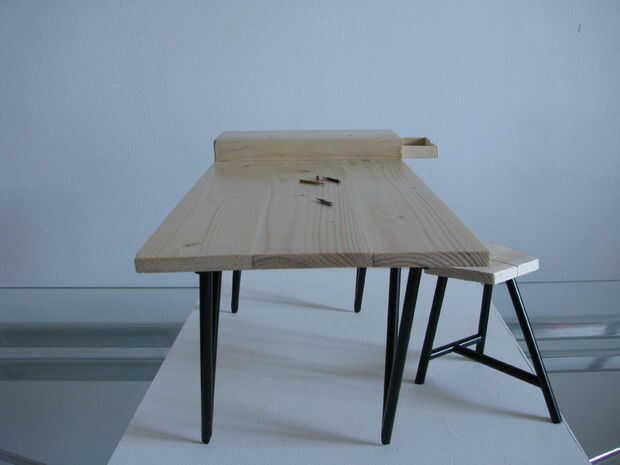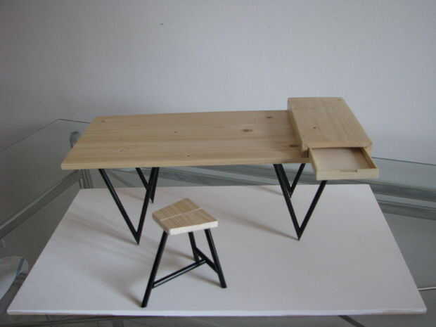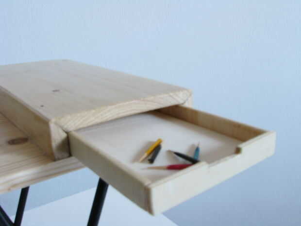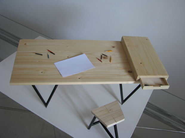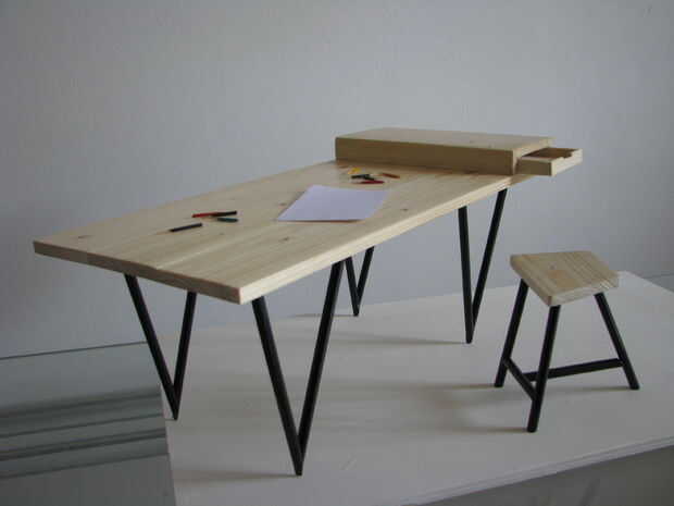 El modelo es hecho de madera de pino para la mesa superior y el superior taburete, tubos de plástico para las piernas y la madera contrachapada para el cajón.