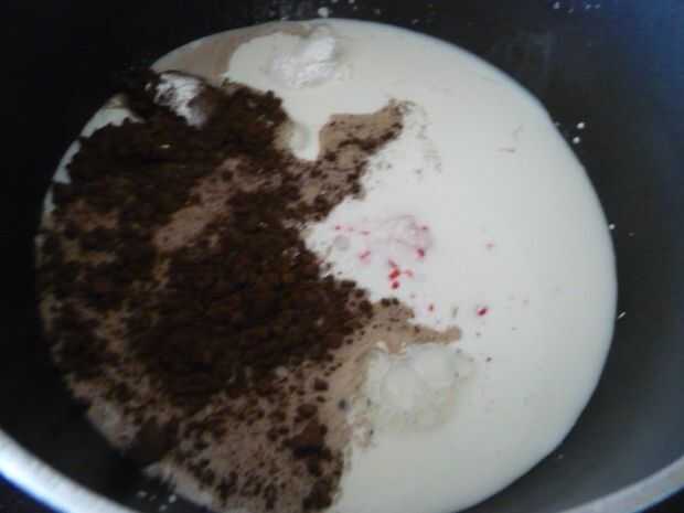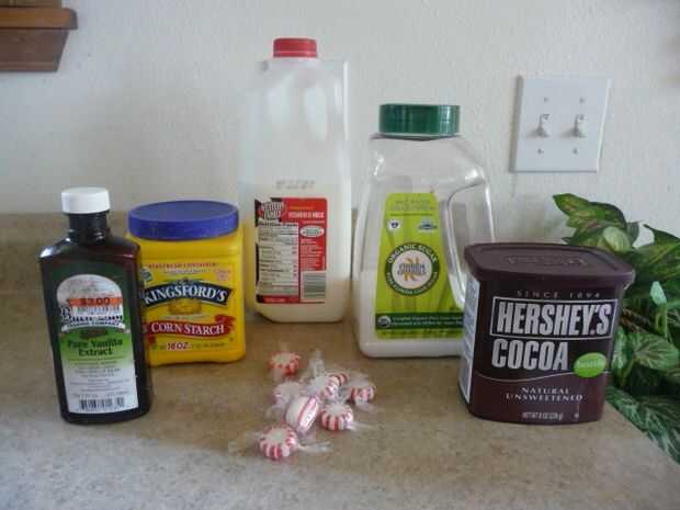 Poner el azúcar de menta en una cacerola mediana. Añadir la leche, la maicena y el cacao en polvo.