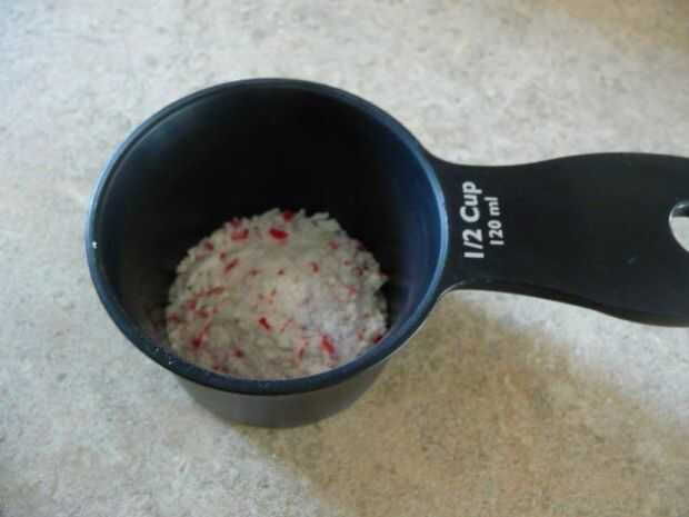 Agregue suficiente azúcar para llenar la taza de 1/2 taza que contiene el caramelo de menta machacada.