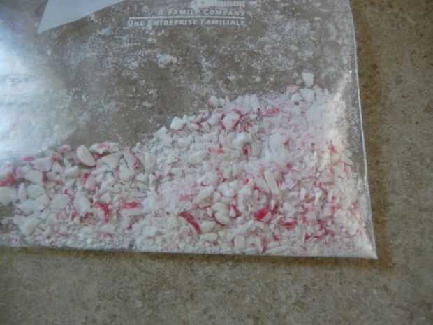 Triturar los caramelos de menta en una bolsita ziplock. Quitar 2 cucharadas y agrega a una taza de 1/2 taza de medir. Vuelva a sellar la bolsa inmediatamente. Humedad causará el caramelo triturado obtener pegajosa y eso no es bueno para la guarnición.