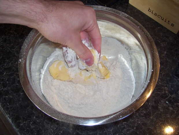 Ahora frote en la mantequilla, siempre recuerda cuando frotando con las puntas de tus dedos y no las palmas como el calor derretirá la mantequilla que no será muy buena. Dando el tazón de fuente un batido traerá los grandes terrones de mantequilla en la parte superior, continuar hasta que se asemeja a pan rallado.