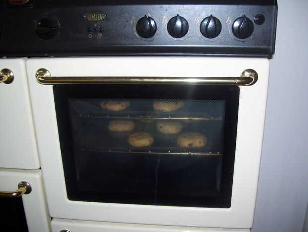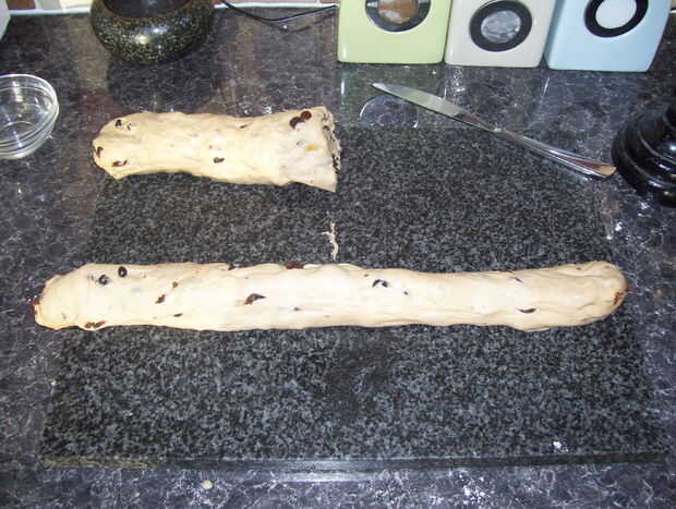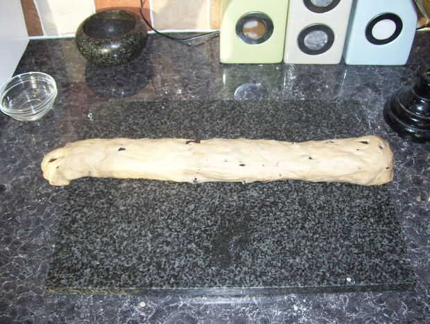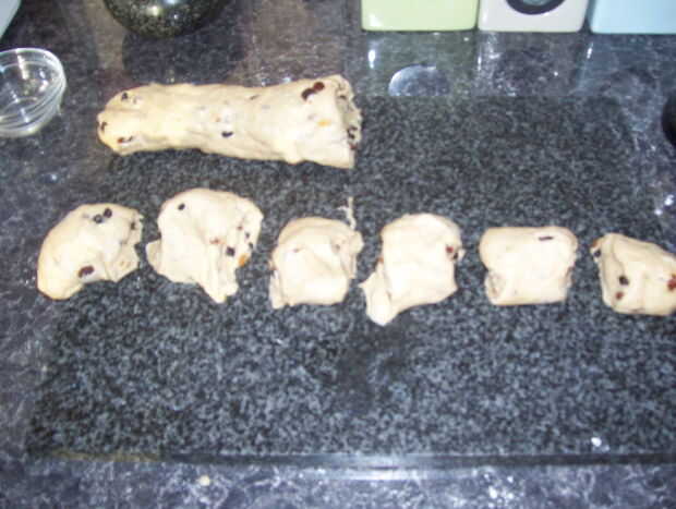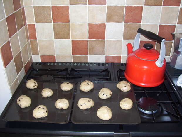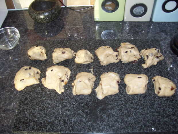 , Tenemos que darles forma les 15 redondos o 12 si quieres teacakes grandes agradables. hacer este rollo de la masa en una salchicha larga incluso y cortarla por la mitad, tomar uno de estos de la mitad y rodar un poco más y entonces dividir este en seis usando la parte de atrás de un cuchillo. Repita para la otra mitad y tienen 12 bultos de masa rollo estas en bolas, plana hacia abajo un poco y colóquelas en una bandeja de horno bien engrasada o un tapete de silicona una bandeja de horno si tienes uno.