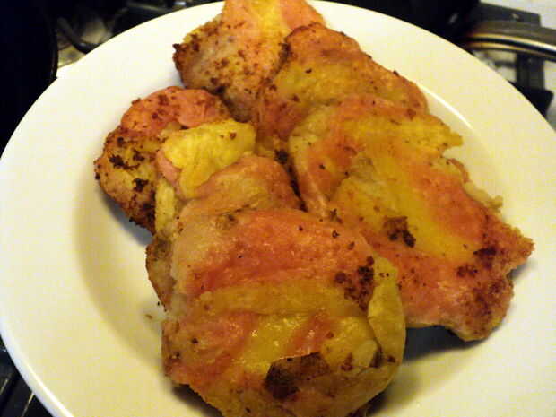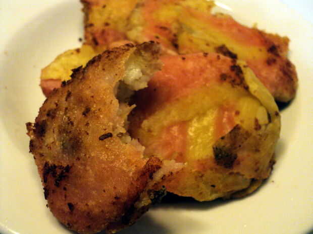Realmente parece muerden en una losa frita snack-tamaño perfecto de porkfat delicioso curado pero en realidad es una bola de masa de patata rellenada de clases. Servir con schmear de mostaza o rábano picante. Es bueno para usted.