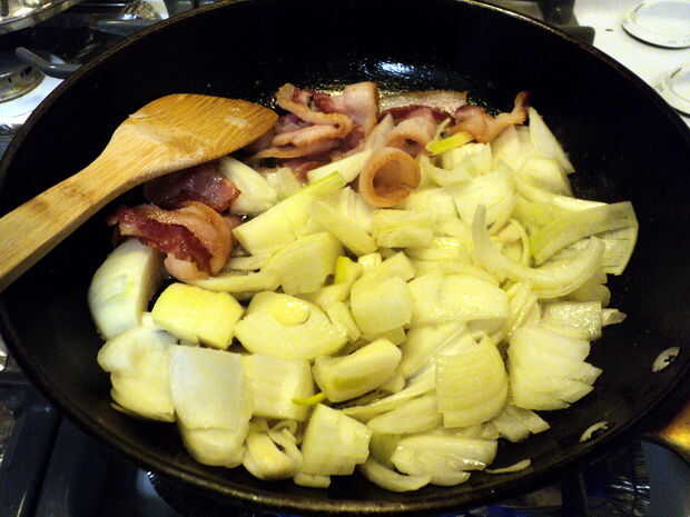 Finalmente dice arriba dos cebollas grandes. Una vez que el tocino empiece a dorarse y ha hecho que la grasa de las tiras de tocino, agregar las cebollas a brown. Puede tomar un tiempo para que la cebolla suelte su humedad y empieza a caramelizar o marrón.