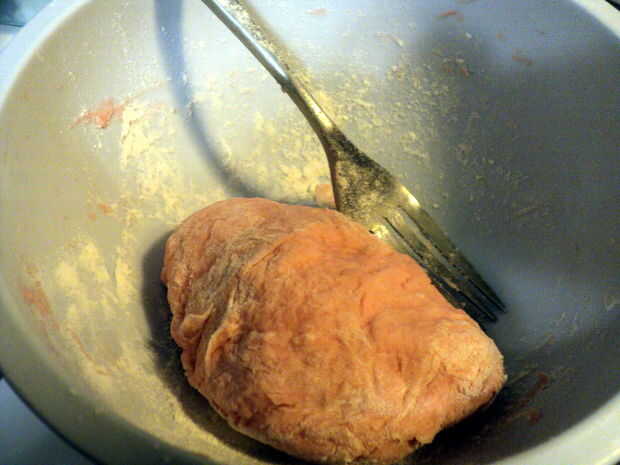 Necesitamos una masa amarilla o llana que la parte grasa. Masa de knish de gabila parece ser un amarillo más brillante posiblemente de agregado cúrcuma.