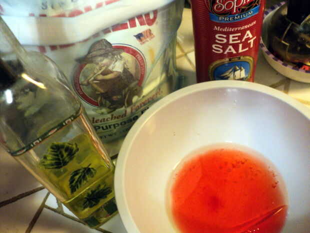 Empieza con unas cucharadas de agua en un recipiente. Disolver unas gotas de rojo colorante allí.
