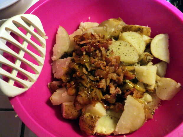 Puede a continuación, agregue el tocino caramelizado la cebolla a la mezcla y puré. Debe tener una mezcla bastante espesa y suave. Agregar leche o crema de líquido adicional si es necesario. Seria buena hacer un knish de papa cargado... y cebolletas o pedacitos de brócoli también una cucharada de crema agria.