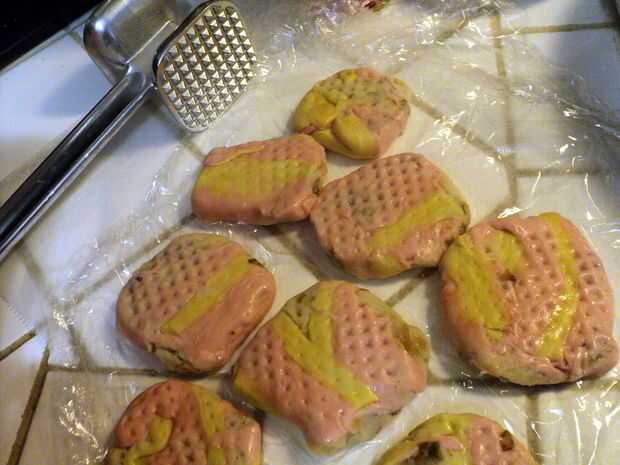 En knish de Gabila, hay algún tipo de textura que aporta a la corteza crujiente. No sé si resulta ser las marcas de correa transportadora de producción o es una textura adicional prevista. Solo presiona en la cara de mi mazo de carne molida o áspera para que la superficie de cada knish su textura. En realidad, un rápido golpe con el martillo funciona así no tienes que agregar harina o aceite en el martillo para que se pegue.