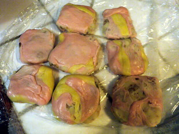Escoger aparte cada una de las porciones y estirar la masa alrededor para pellizcar y sellar las costuras abiertas.