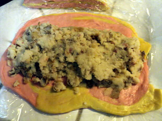 Su relleno de tocino-cebolla-puré-tater y una capa gruesa en el centro o un lado de la masa.