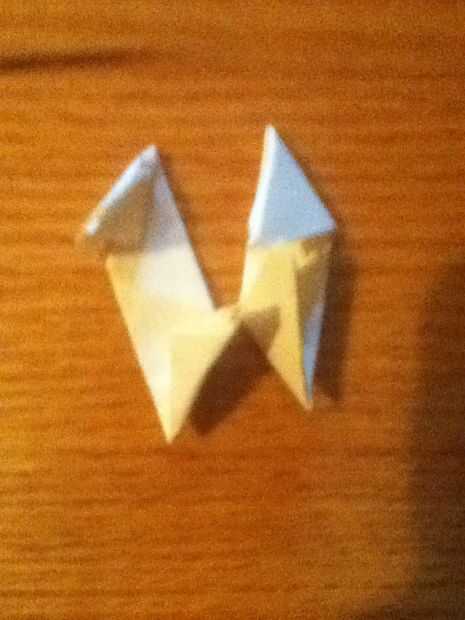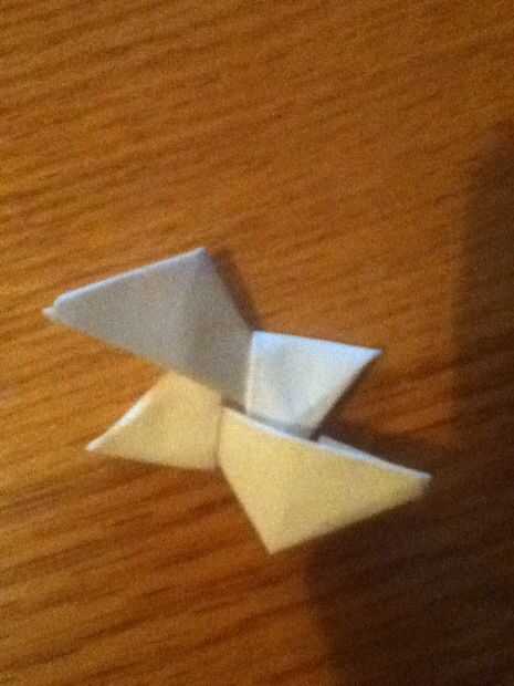 Plegar ambos triángulos en el centro. Que despliegan. Luego ponen unos sobre otros. Tomar los puntos de la parte inferior 1 y meter debajo de las aletas. Dale la vuelta y hacer lo mismo.