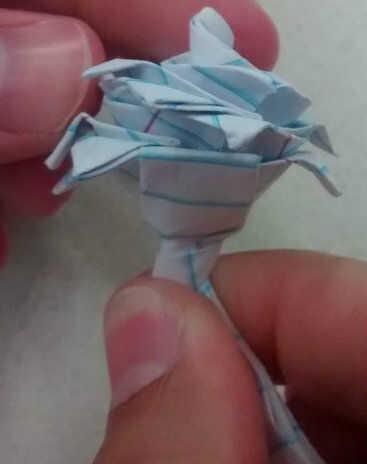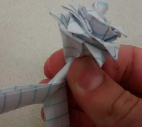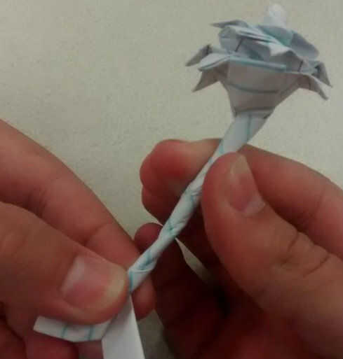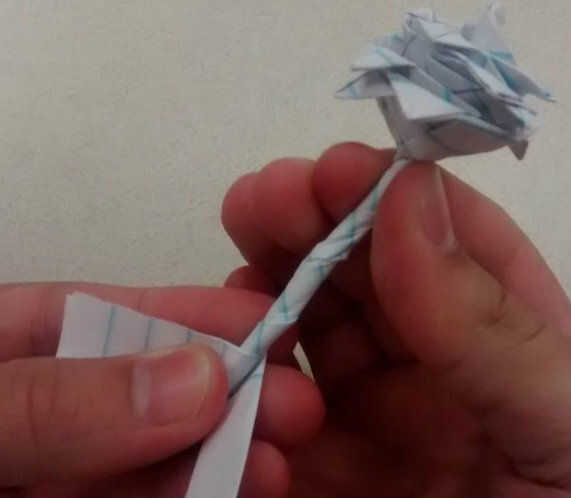 Doblar dos de las piezas del tallo aproximadamente un ángulo de 45 grados en la base del capullo de rosa. Doble dos de las piezas del tallo en el pliegue que acaba de hacer. Tomar la primera pieza de tallo y doblar para el lado opuesto de la segunda pieza de la madre. Tuerza las piezas paso muy firmemente y tire de ellos hacia abajo hacia los extremos de las piezas del tallo. Asegúrese de no torcer demasiado apretado y rasgar el papel, pero también el giro lo suficientemente apretada como para que el vástago es firme. Dejar de torcer el justo antes del final de las piezas de madre así que hay dos pestañas pequeñas en la parte inferior del tallo.