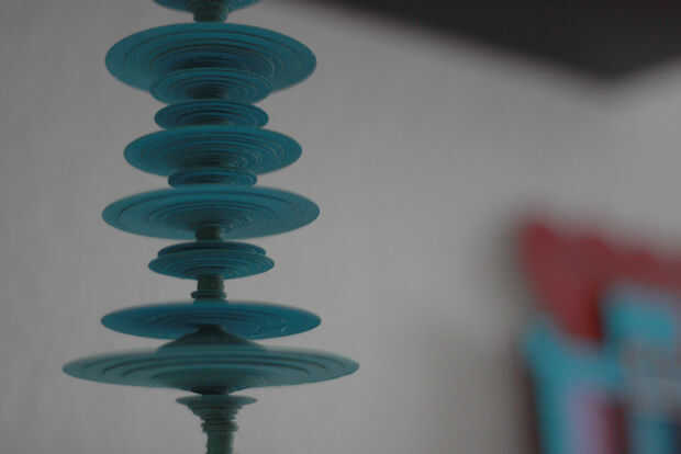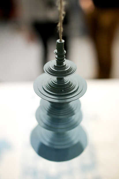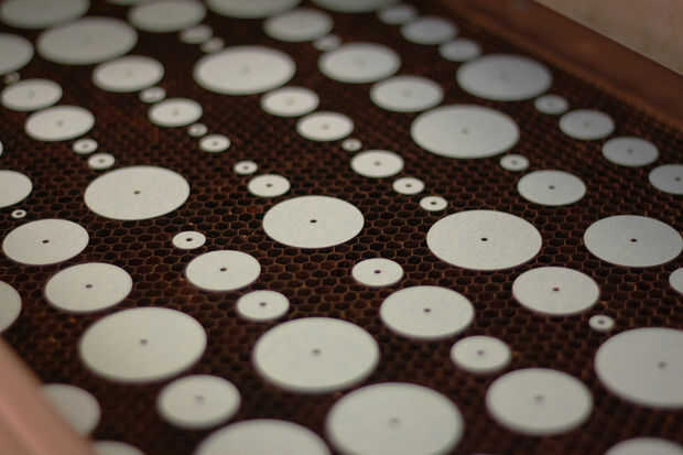 El usuario registra un mensaje o un sonido que es analizado por el programa y asignan a una forma de onda de 450 puntos de muestra. Cada punto de muestreo se transforma en un disco de papel con el tamaño del disco que representa el volumen de la grabación en un punto específico - el más fuerte el volumen, cuanto mayor sea el disco. Nuestro algoritmo de la escala de la forma de onda física a un tamaño de la escultura de aproximadamente 14cm.