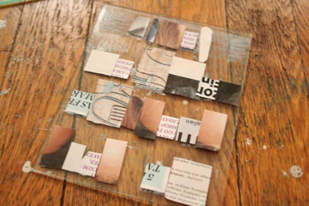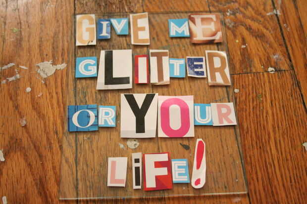 En primer lugar, cortar las cartas de muchos tipos de letra que más te guste de revistas viejas. Después de planear su nota de rescate y, decoupage les en una de las placas de vidrio. Mi mejor opción: Añadir una capa de Mod Podge para el vidrio, pegar las imágenes boca abajo sobre el cristal, y añadir unos 2 más capas en la parte superior para sellar. Mi nota de rescate, dice "Me da brillo o tu vida!"