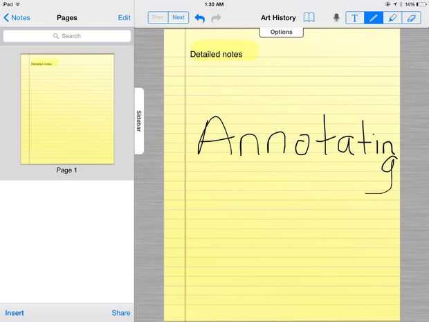Después de tomar notas en múltiples niveles de anotación de estas notas permite un trato personal a las notas. Mediante la selección de la pluma en la parte superior derecha permite una persona anotar.