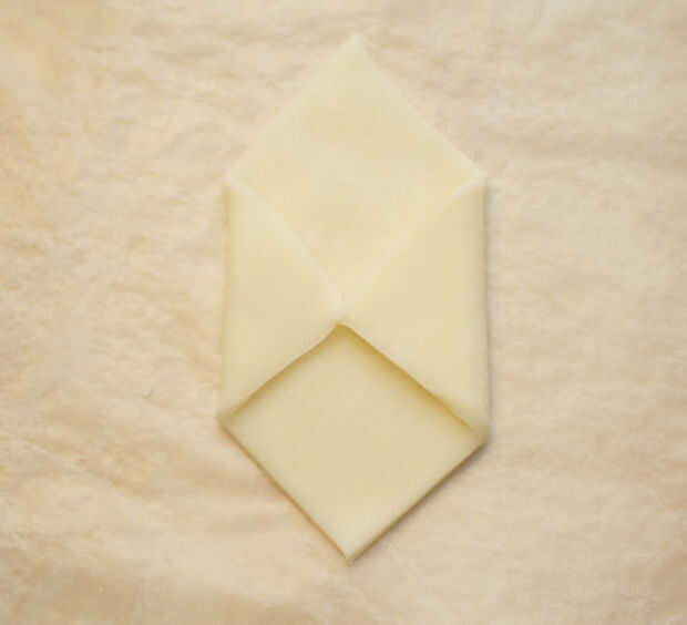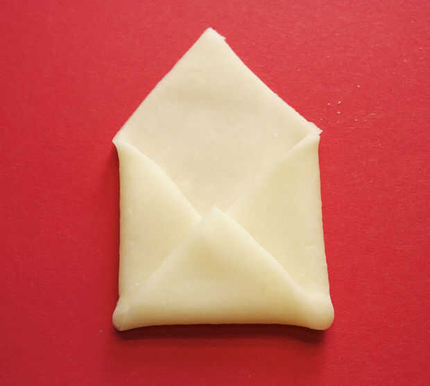 Rollo blanca modelar chocolate 1/4 pulgada de espesor sobre una superficie lisa espolvoreada con fécula de maíz.   Con un cuchillo, cortar un cuadrado o una envoltura más alargada, un diamante desproporcionado como por debajo.  El tamaño dependerá de lo grande que es la nota de corazón van dentro.  Pliegue en los lados, luego doble la parte inferior y presione suavemente en su lugar.  Utilice la brocha para cepillar cualquier exceso de maicena en el chocolate.