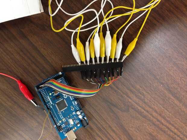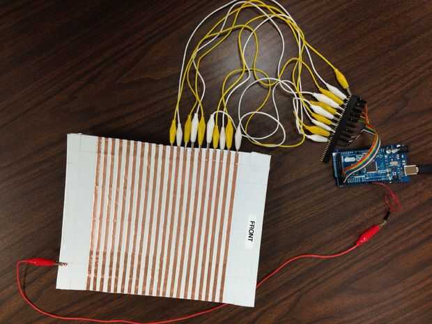 Conecte las líneas de salida a cada pieza horizontal de cinta de cobre sobre la superficie de la música. Estábamos seguros de nuestras líneas para hacer un seguimiento de todas las líneas de salida 22 de código de color. Puede soldar estos si quieres, o utilizar pinzas para conexión rápida. Entonces coloque estas líneas a los pines digitales de su Arduino Mega. Comenzamos nuestros pins de receptor en el pin 22 con el fin de separar las clavijas del receptor de nuestro remitente. Nuestro pin de remitente está conectado al pin 2. Si desea cambiar estos, necesita modificar el código en consecuencia.