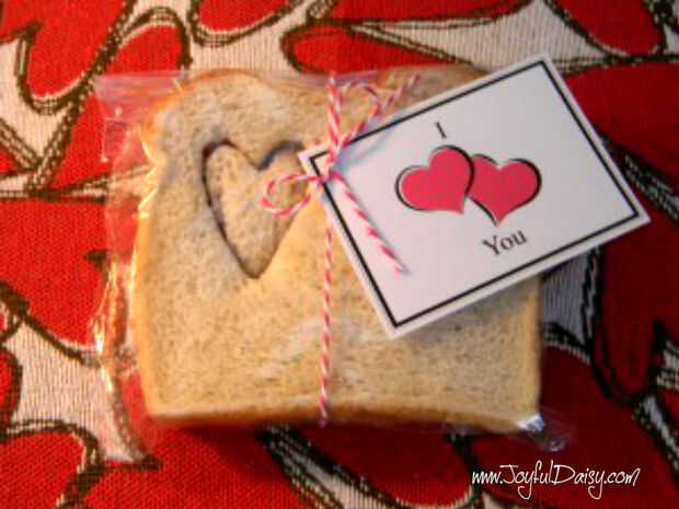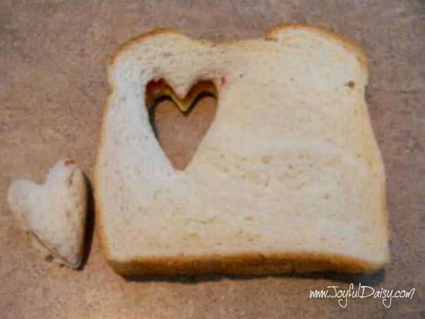 OK, esto es super sencillo. Hacer un sándwich, ya sea de carne y queso o a su clásico mantequilla de maní y jalea. Usando un cortador de galletas pequeño, cortar un pequeño pedazo. En realidad originalmente había planeado cortar un corazón grande y enviar un emparedado crustless, sin embargo, es más grande mi cortador de galletas de corazón grande entonces el sándwich!