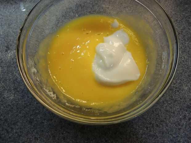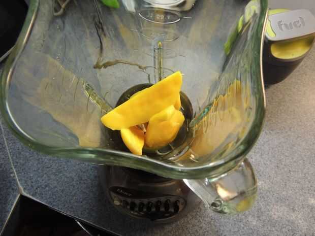 Ponga el mango super maduro y agua en una licuadora y mezcla hasta que quede suave. Debe tomar aproximadamente 30 segundos. Luego Vierta el puré en un bol. Si quieres una salsa de "queso cremoso" requete puede colar por un colador primero, pero he encontrado esto innecesario. Agregue 4oz (2/3 de la Copa de yogur) en el puré y mezclar hasta combinar.