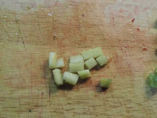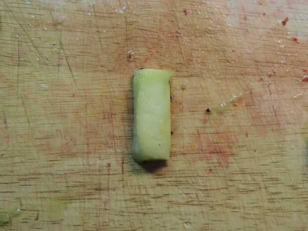 Tomar la parte central del kiwi y cortar 4 rebanadas más y deshacerse de ellos para dejar sólo la parte blanca del centro del kiwi. Otra vez, si hay semillas, ahora es el momento de deshacerse de ellos. Es casi imposible de quitar las semillas una vez que se corta en pedazos. Cortar el kiwi restante en tiras y dados para formar pequeñas piezas de "cebolla".