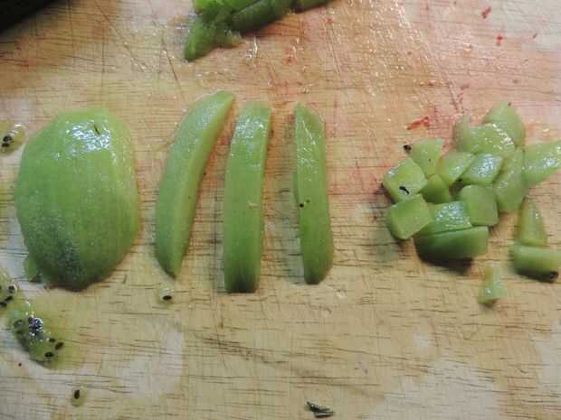 Pelar el kiwi y corte la punta y la parte inferior. De la misma manera que la fresa, corte las partes verdes brillantes haciendo 4 rebanadas. Estos sectores deben ser algo fino para evitar que las semillas. Después de cortar las 4 secciones, otra vez sopa juliana y dados las rodajas. Si tienes las semillas en sus segmentos, cuidadosamente raspe las semillas con un cuchillo y deshacerse de ellos antes de cortarlo en trozos.