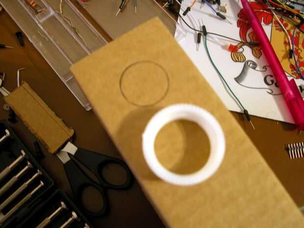 Puesto que los botones son grandes y circulares puedes ya sea usar un cortador circular (como lo hice para mi MAME cabinet[0]) o empujar un montón de pequeños agujeros en un círculo, con un destornillador, hasta que la tarjeta entre los agujeros se debilita. Elegí este último. Porque los botones tienen un labio sobre ellos, usted puede empujar bastante bien en los agujeros mal ajustados, y el labio cubre la mano de obra. Los botones vienen con bastante agradable plástico forro monturas, también, que realmente sostenga los botones en su lugar.