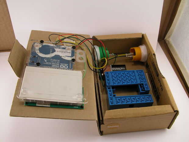 Conecte un altavoz. O, para ser correcto, un zumbador piezoeléctrico. Esto es un asunto simple, conectado entre el pin analógico 2 y tierra, con su borde externo blu viró a la tapa de la caja. Utiliza cables de su piezo, si los tienes, ya que detendría el timbre viene separado cada vez que abres la tapa.