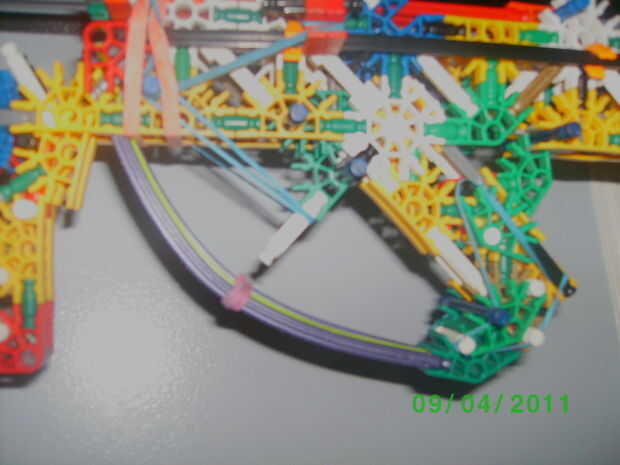 A k'nex gun shaped like the letter "S". O 5. Se hizo porque echaba de menos entrar en el torneo de Jollex y decidió publicar un arma basado en los requisitos del concurso, una pistola con gatillo complejo con partes móviles. Tiene un conector gr