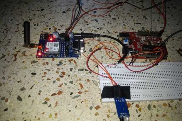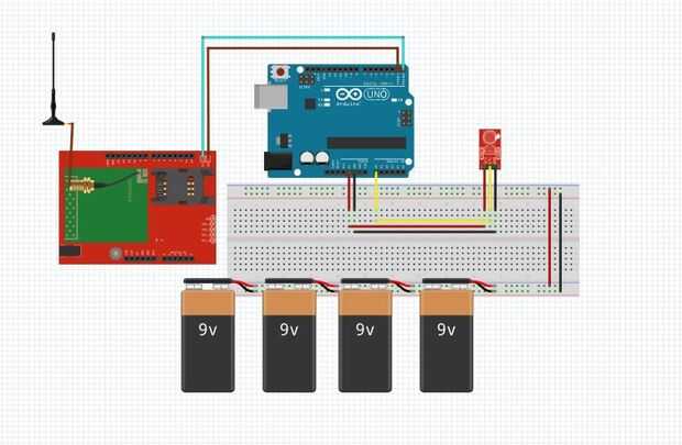 GSM módem requiere gran cantidad de corriente tan utilizar fuente de alimentación 12v 1amp para él. En mi caso utilicé cuatro pilas de 9v en paralelo. Ahora conectar el pin vcc de sensor ir a 5v de arduino, conexión gnd a gnd de arduino y análogo a pin del sensor a la A0 de arduino.