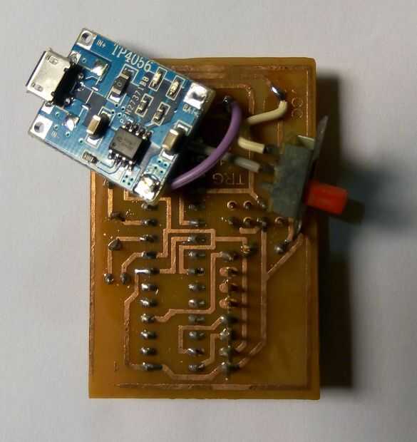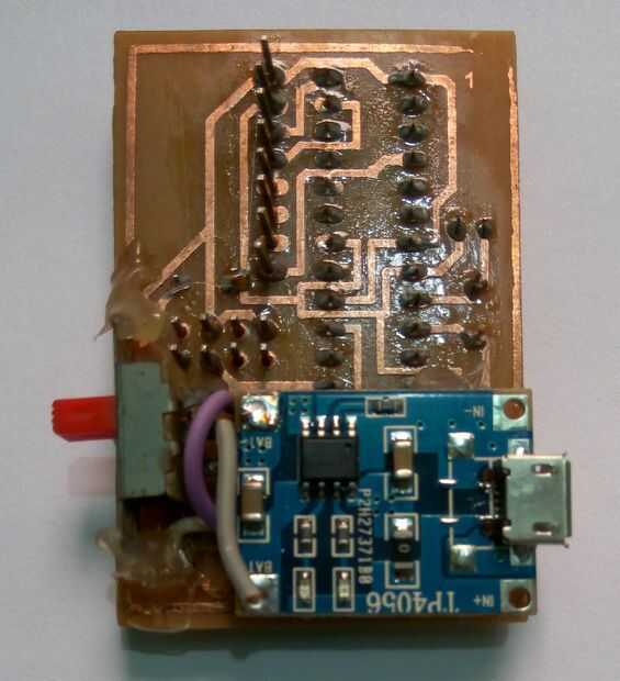 Ahora, conectar una batería lipo carga el módulo en la parte posterior del PCB. Como usted está conectando en la parte trasera tienes que utilizar pegamento caliente para atado con PCB. Tenga cuidado con corto circuito. Hacer suficiente distancia entre pad soldada y el módulo de carga cuando coloque pegamento caliente. También debe conectar un interruptor on-off con el módulo.