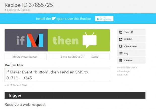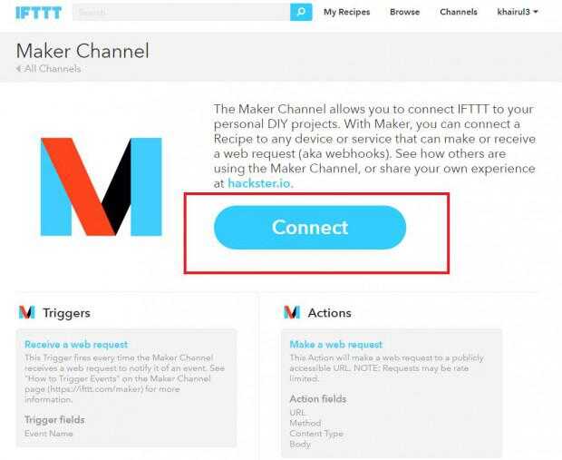 Voy a utilizar canal fabricante de recibir una petición GET de ESP8266 módulo cuando se dispara por chip ATmega. Fabricante de canal entonces enviar un SMS a un número predefinido utilizando el canal SMS. Por lo tanto, vamos a explicar cómo trabajar con IFTTT.